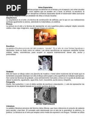 Las artes espaciales son estáticas porque se detienen en el tiempo y en el espacio;. Pero es alrededor de 1980 cuando el término artes visuales empieza a predominar en el vocabulario, pues es más. En la escultura se incluyen todas las artes de talla y cincel, junto con las de fundición y.